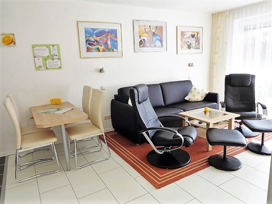 Die optimal geschnittene, 45m² große, lichtdurchflutete Wohnung hat vom Wohnraum aus direkten Zugang zur überdachten Terrasse. Der integrierte Essbereich und die offen gestaltete, neue Küche, wie auch die gesamte Wohnung, lassen keine Wünsche offen. Wohnraum: Die gemütliche Leder-Couchgarnitur mit Relaxsessel und Fußhockern, Flatscreen-TV, DVD- und CD-Player, Radio, Gesellschaftsspiele sowie eine kleine Auswahl von Büchern lassen keine Langeweile aufkommen. Ein "Infoordner" gibt Anregungen für Ausflüge und über Veranstaltungen in nah und fern. Der Essbereich, mit 4 Lederstühlen, ist für 2 Personen großzügig gestaltet. Das separate Schlafzimmer ist mit einem seniorengerechten Doppelbett (180x200) ausgestattet mit zwei Bandscheibenmatratzen, einem großen Kleiderschrank und einem weiteren Flatscreen-TV möbliert. Die neue, moderne, weiße Hochglanzküche verfügt über alle Elektrogeräte, die im täglichen Leben benötigt werden: |